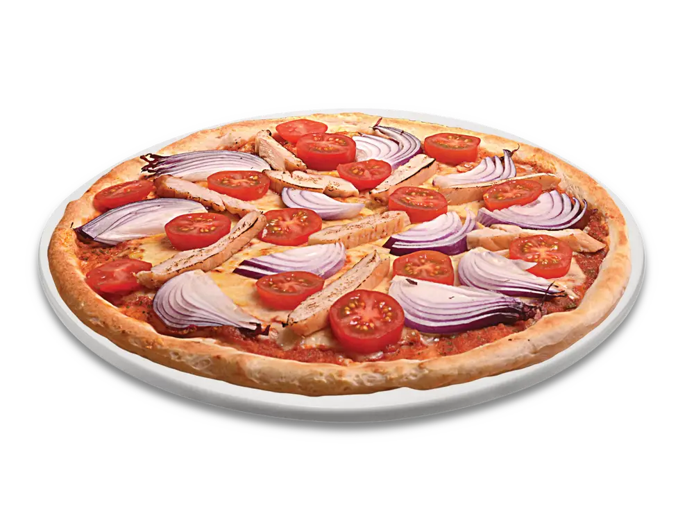 Frischer Teig, Tomatensauce, echter Käse, Knoblauch, Tomatenscheiben, Hühnerbruststreifen, Zwiebeln